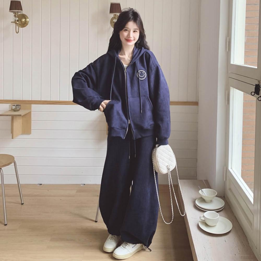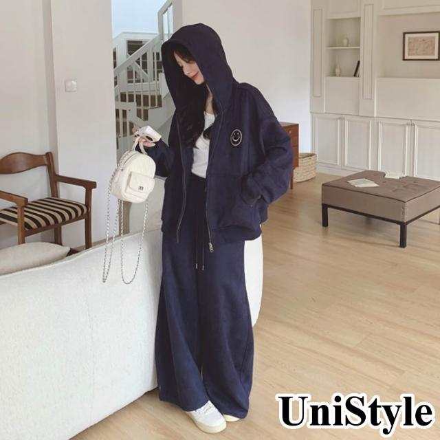 UniStyle秋冬2件套裝麂皮絨長袖連帽外套闊腿休閒長褲 韓系運動風 女 ZMR2C179-627(藏青)