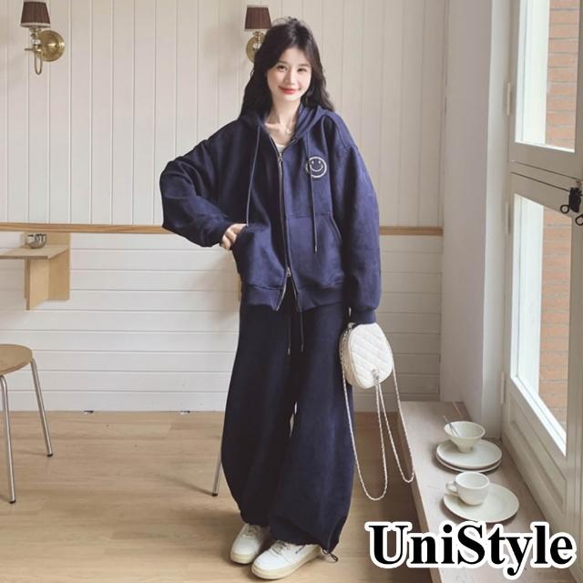 UniStyle秋冬2件套裝麂皮絨長袖連帽外套闊腿休閒長褲 韓系運動風 女 ZMR2C179-627(藏青)