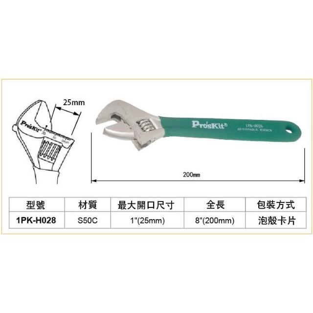 Pro'sKit 寶工 1PK-H028 八吋 鈦金防滑活動扳手 本體附刻度指示 尺寸控制容易 麻面防滑手柄 扳手