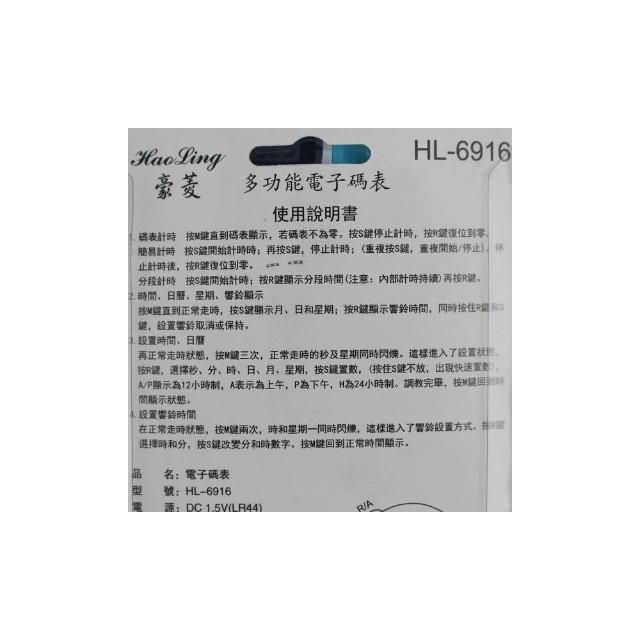豪菱 多功能電子碼表 HL-6916/一個入(碼錶 時鐘 鬧鈴 日曆 計時)-智4714247335103