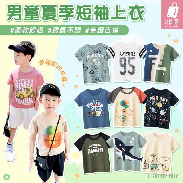i揪團 男童夏季短袖上衣 純棉上衣 男童短袖上衣 兒童短袖上衣 短袖T恤 短T 圓領上衣 薄款 卡通印花 恐龍鯊魚車車動物(F24-3/F24-4)