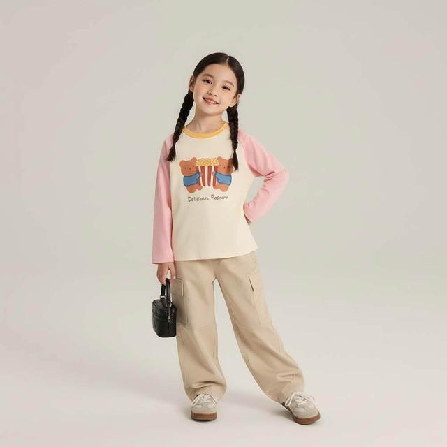 i揪團 兒童純棉圓領休閒長袖T恤 草莓插肩袖 女童長袖上衣 薄款T恤 兒童長袖 印花棉質童裝 拚色 撞色(B71)