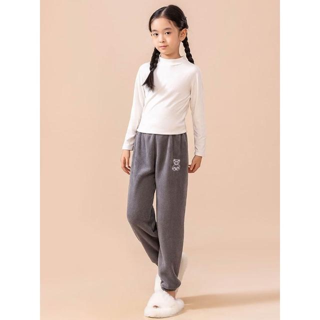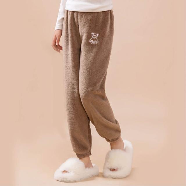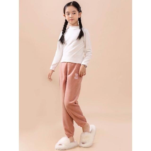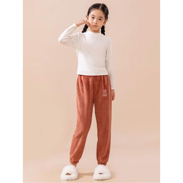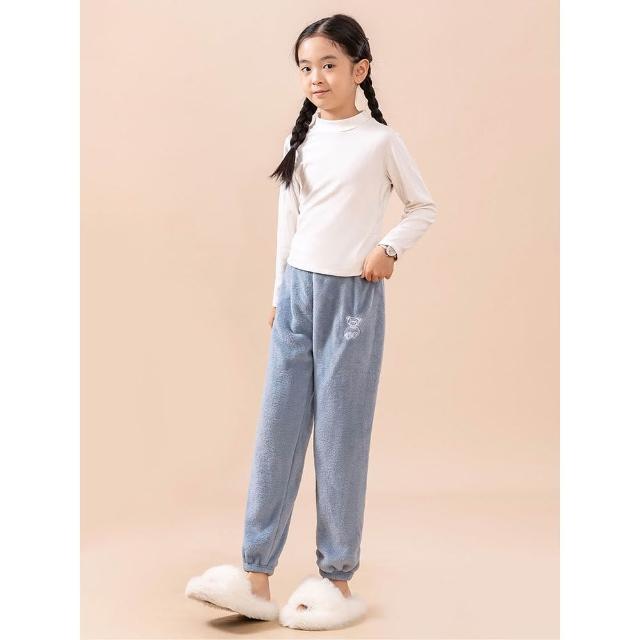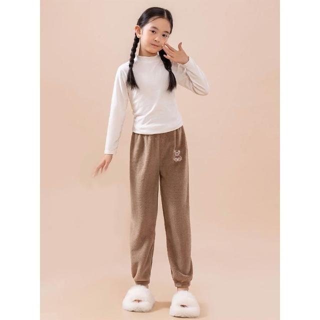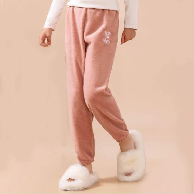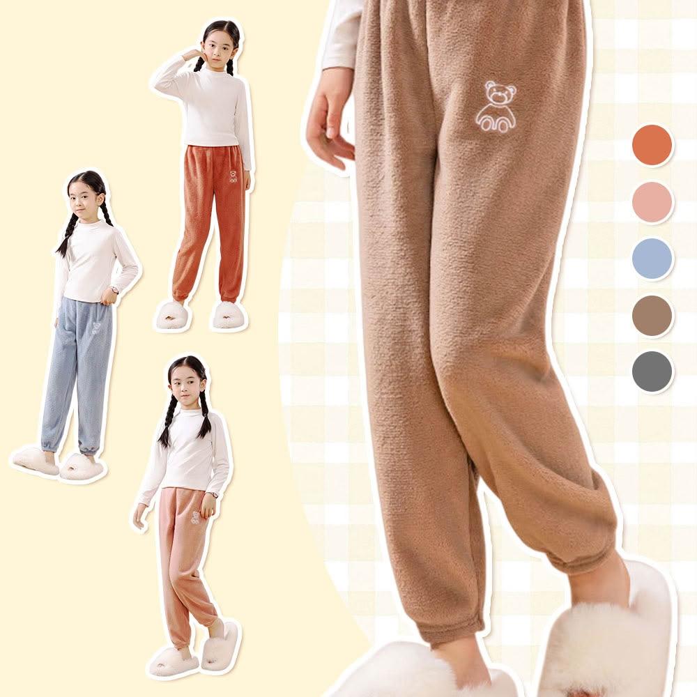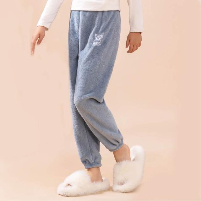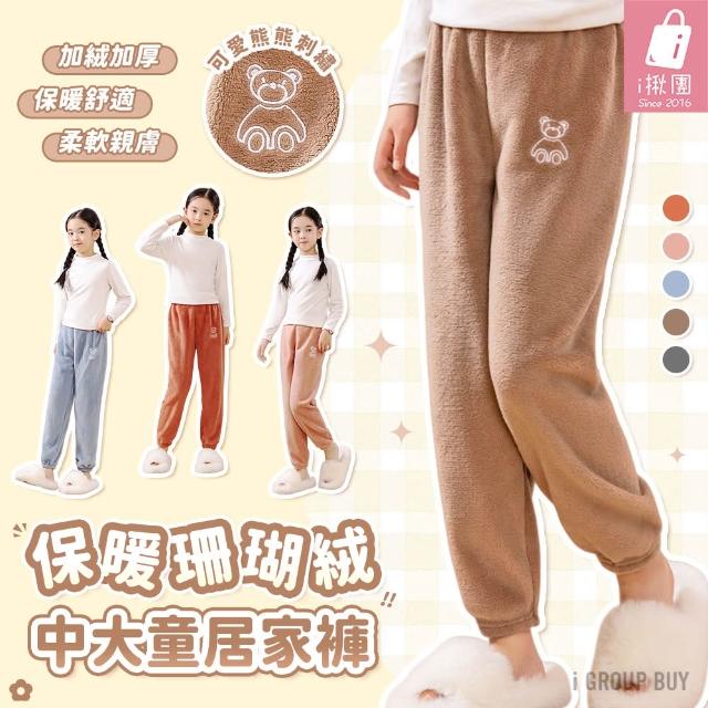 i揪團 保暖珊瑚絨中大童居家褲 加絨加厚 兒童居家長褲 兒童睡褲 保暖睡褲 束腳褲 束口褲 小熊刺繡 秋冬(K77-1)