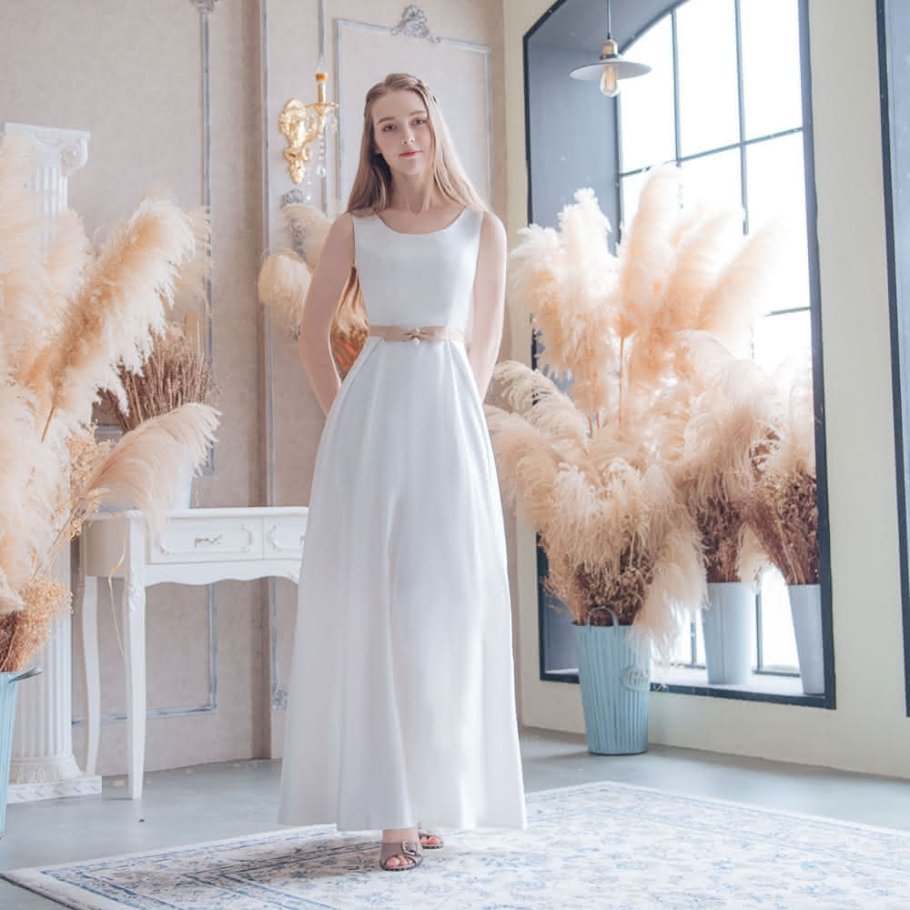 OMUSES簡約蝴蝶結白色伴娘長禮服19-1920