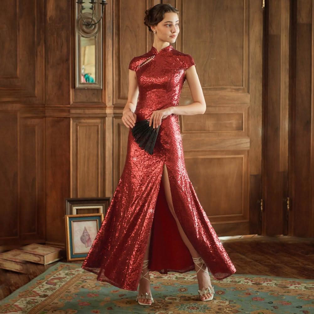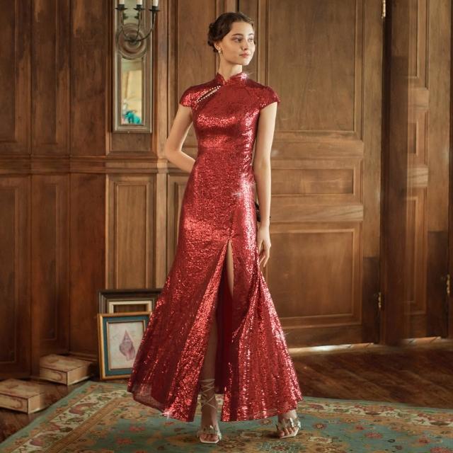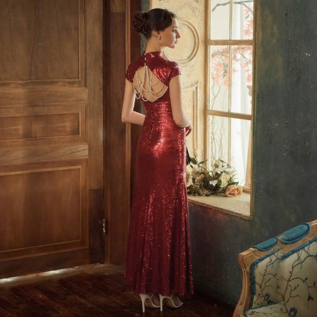OMUSES手工亮片珍珠美背紅色旗袍長禮服7-A2223