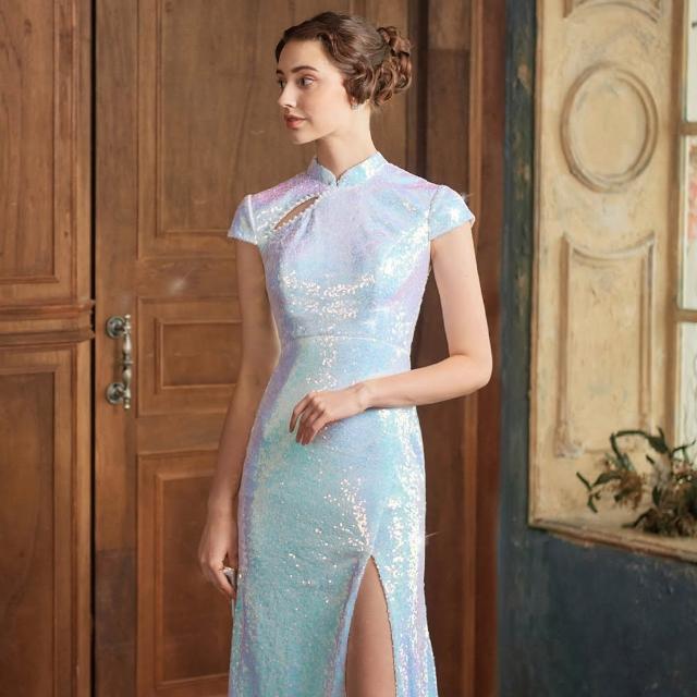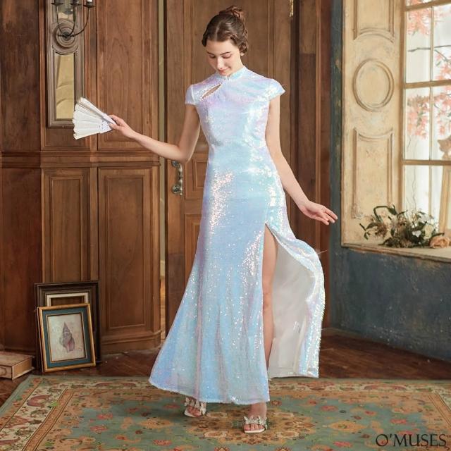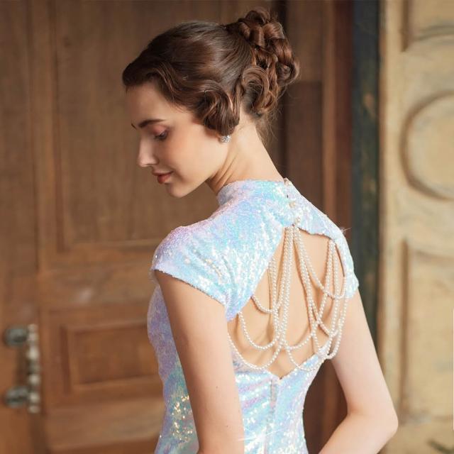 OMUSES手工亮片珍珠美背白色旗袍長禮服7-A2223