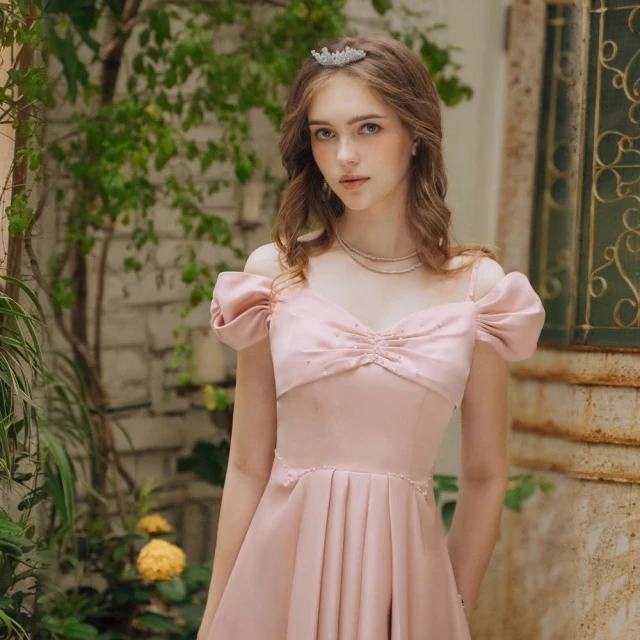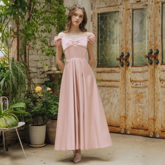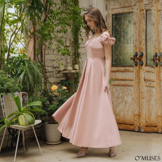 OMUSES一字領露肩蝴蝶結粉色長禮服19-504-D