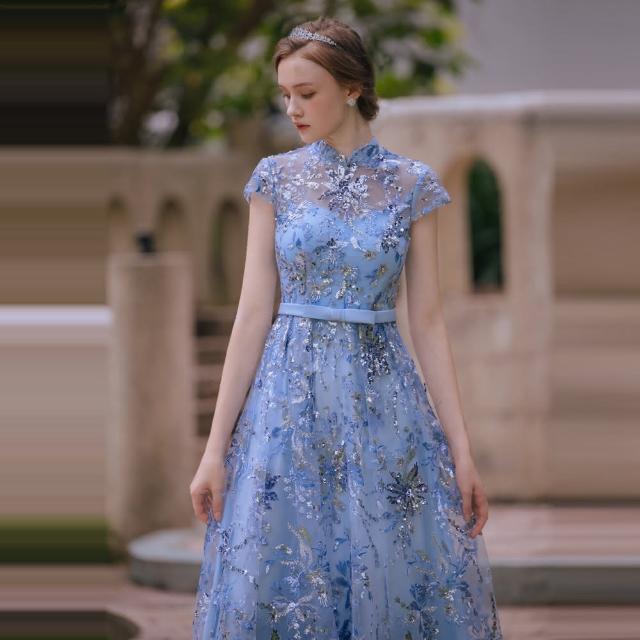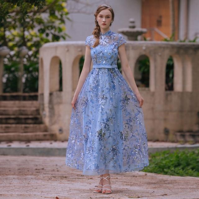 OMUSES手工亮片刺繡藍色長禮服19-2406