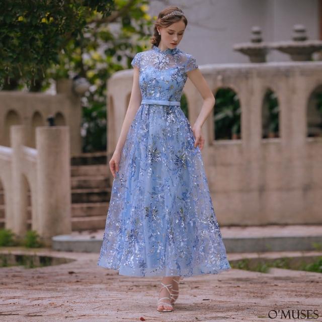 OMUSES手工亮片刺繡藍色長禮服19-2406