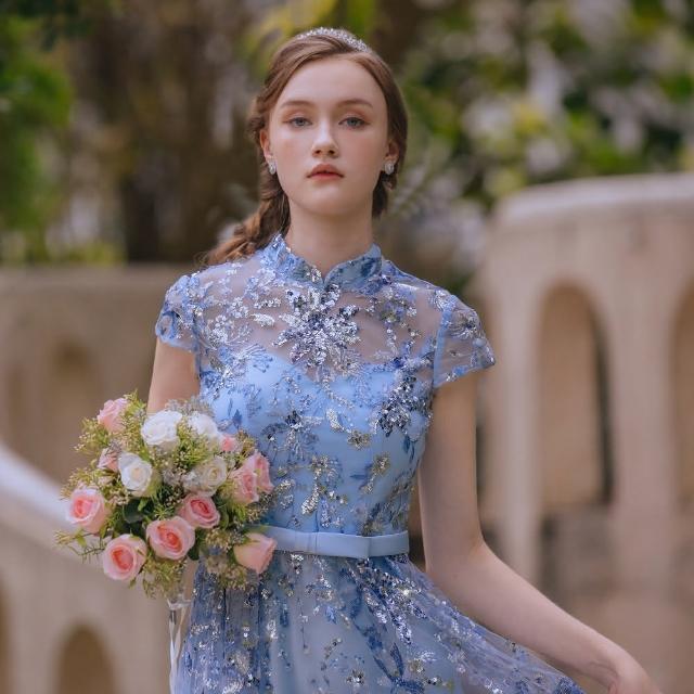 OMUSES手工亮片刺繡藍色長禮服19-2406