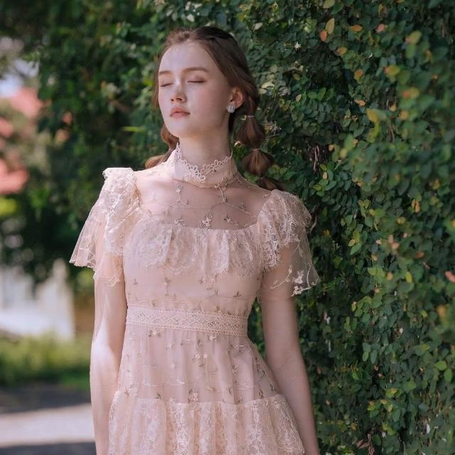 OMUSES蕾絲刺繡粉杏色蛋糕裙長洋裝60-7527