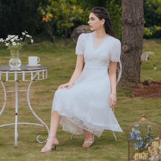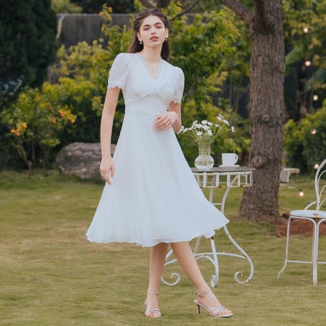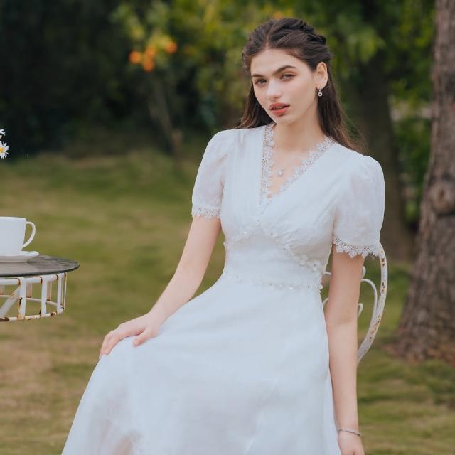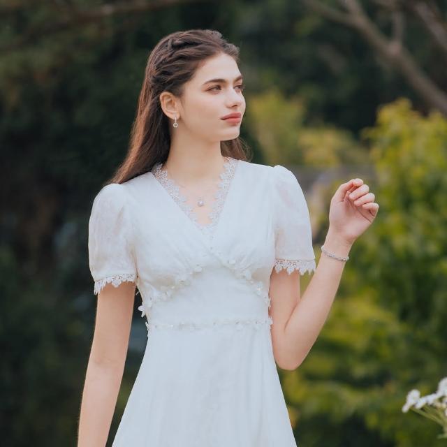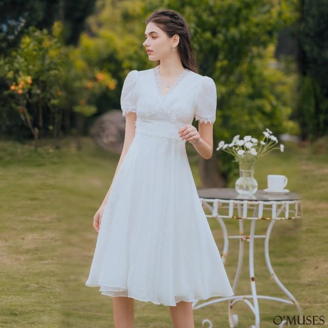 OMUSES重工V領蕾絲刺繡白色長禮服29-30588