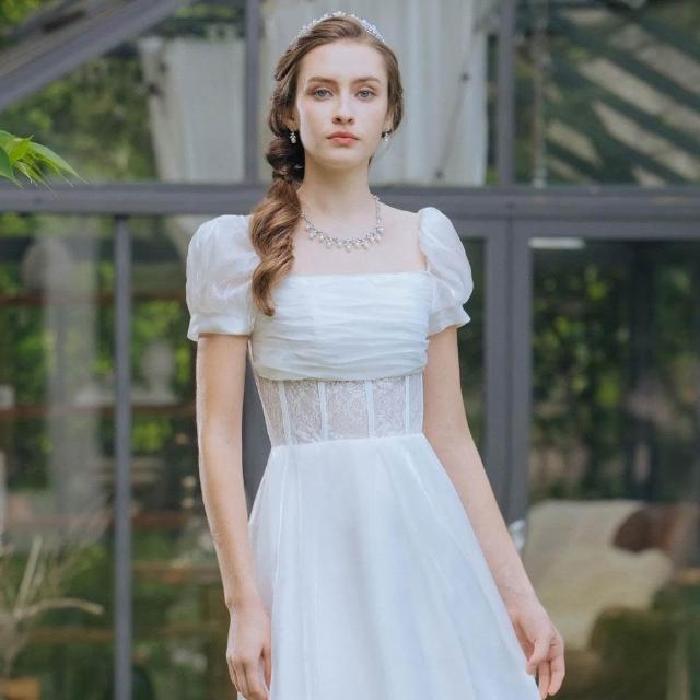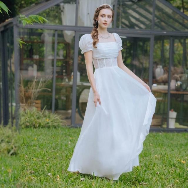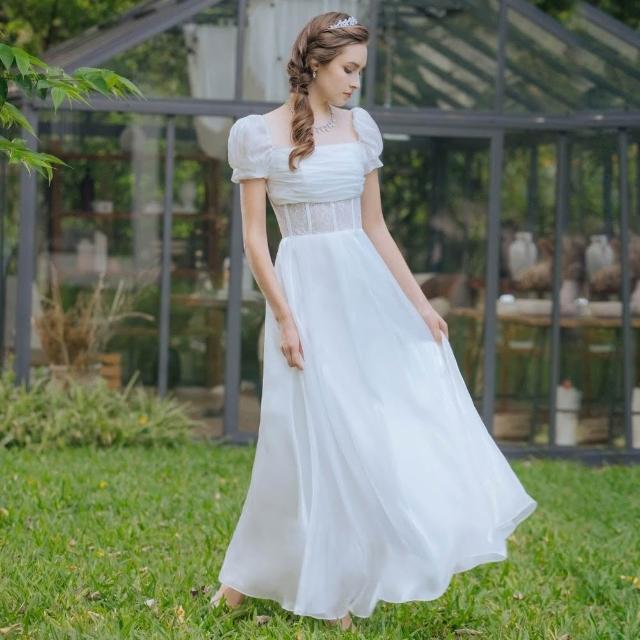 OMUSES一字領方領蕾絲拼接白色長禮服19-7516