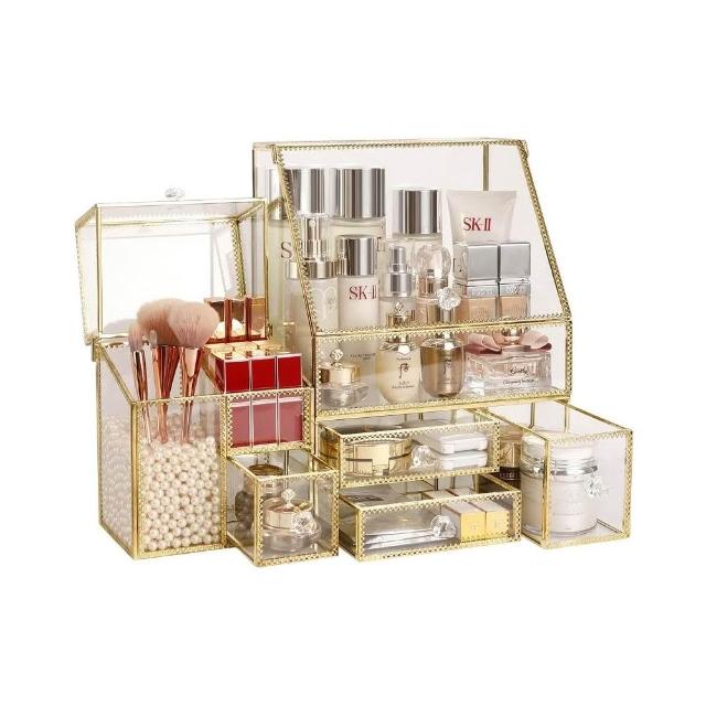 輕奢化妝品收纳盒/輕奢化妝鏡 玻璃金邊 一起購(化妝品收納盒 桌上收納 化妝品收納 桌面收納 飾品收納 保養品收納)