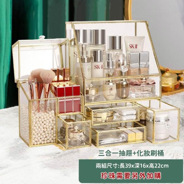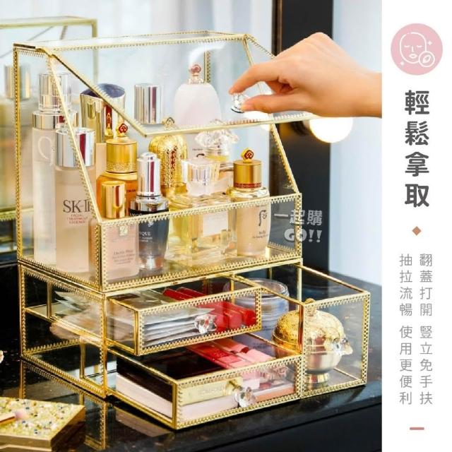 輕奢化妝品收纳盒/輕奢化妝鏡 玻璃金邊 一起購(化妝品收納盒 桌上收納 化妝品收納 桌面收納 飾品收納 保養品收納)