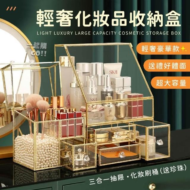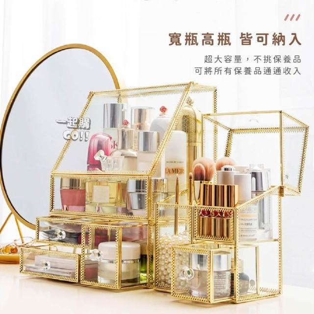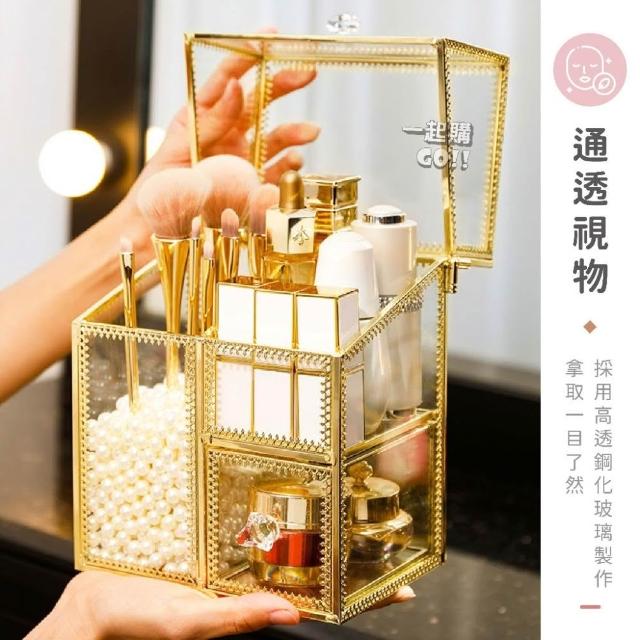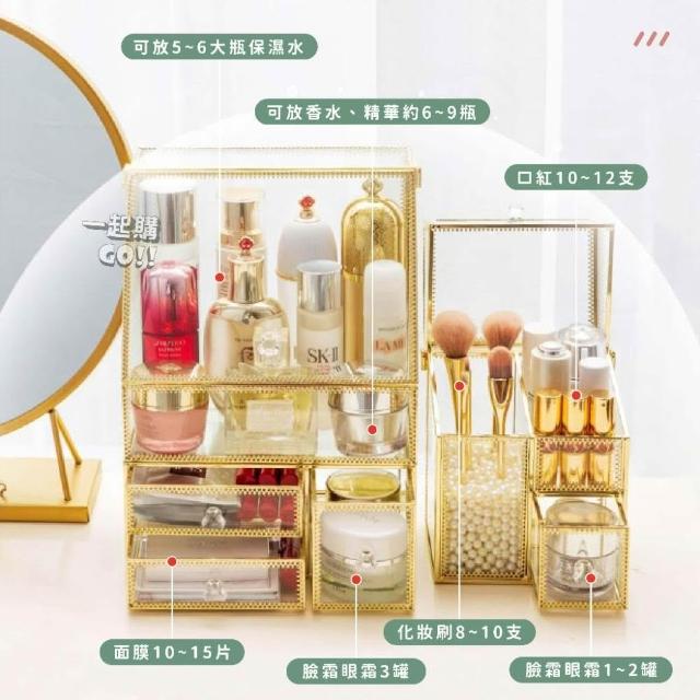 輕奢化妝品收纳盒/輕奢化妝鏡 玻璃金邊 一起購(化妝品收納盒 桌上收納 化妝品收納 桌面收納 飾品收納 保養品收納)