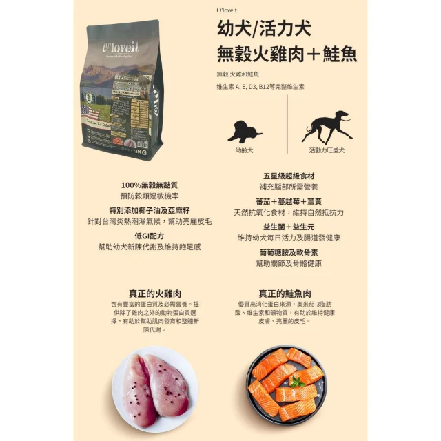 歐力 幼犬/活力犬 無穀(火雞肉+鮭魚) 2KG/6KG 狗飼料 全齡犬 幼犬 成犬飼料