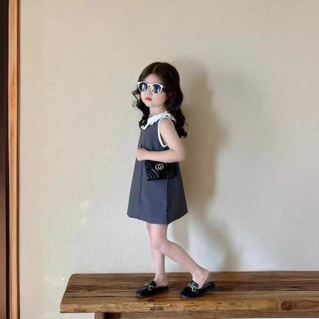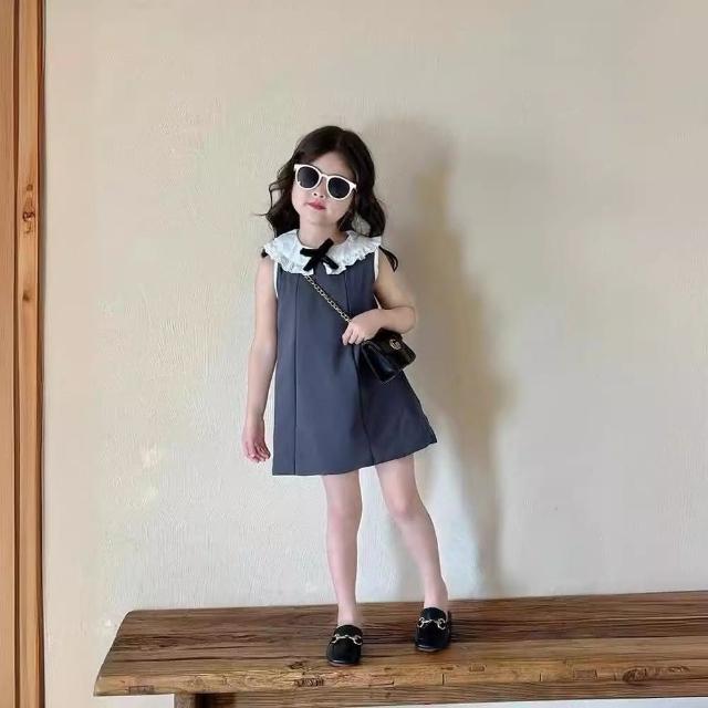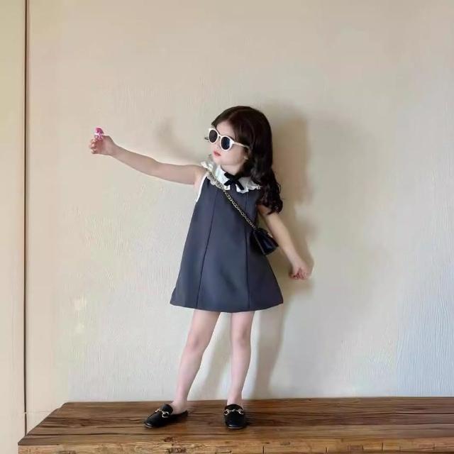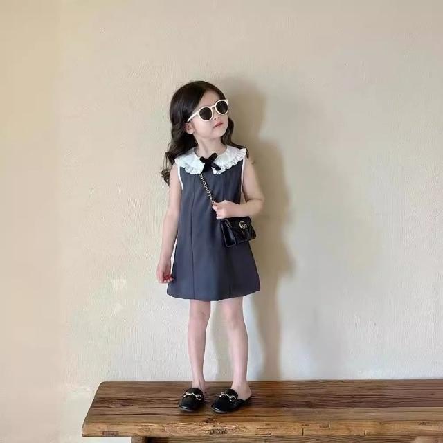 Arbea小香風女童夏季新款小眾復古木耳邊娃娃領蝴蝶結無袖連身裙 C981