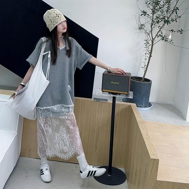 Arbea中大童120-170碼女童蝴蝶結大V領短袖套裝中大童夏新款韓系卹蕾絲拼接半身套裝 C1124