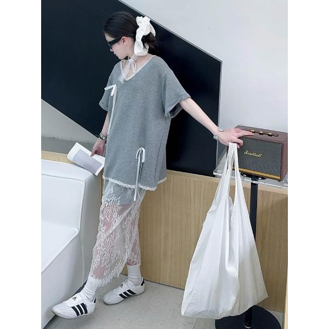 Arbea中大童120-170碼女童蝴蝶結大V領短袖套裝中大童夏新款韓系卹蕾絲拼接半身套裝 C1124