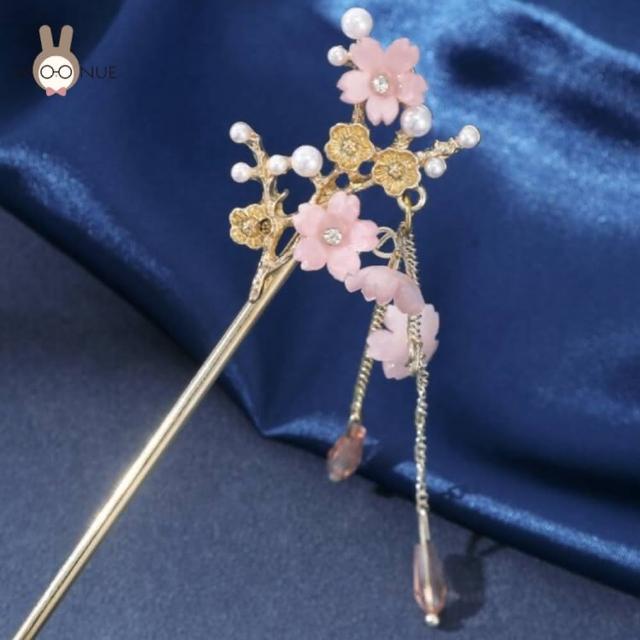 WOONUE高品質皇家奢華粉嫩珍珠櫻花金簪髮飾夾(兒童新娘髮妝老婆女友情人節婚禮小物表演演員母親節生日禮物)