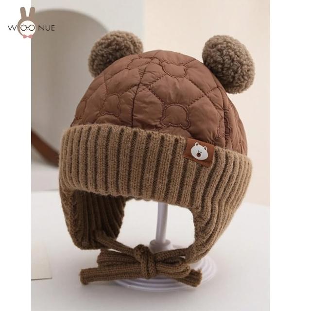 WOONUE可愛小熊耳雙球毛絨寶寶嬰幼兒高質感加厚保暖護耳帽飛行帽(親膚加厚保暖安全6個月-3歲)