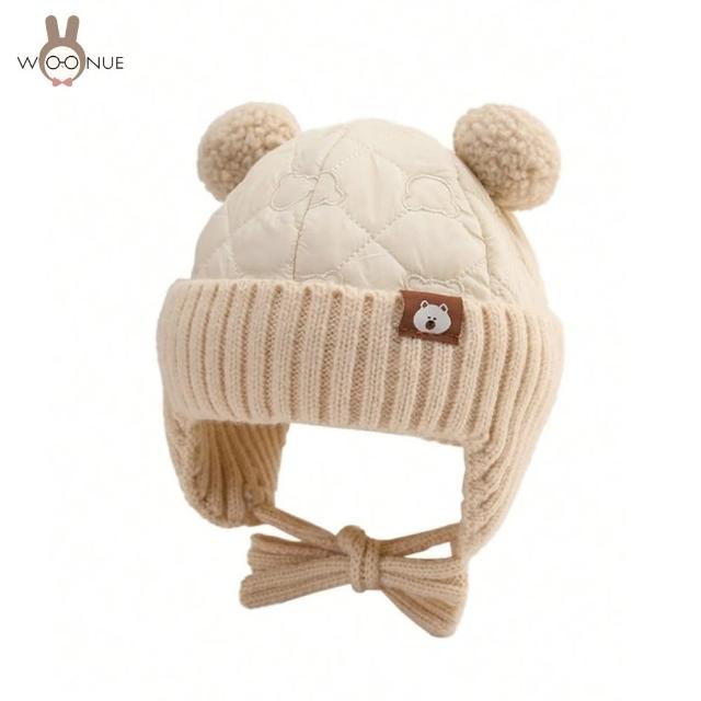 WOONUE可愛小熊耳雙球毛絨寶寶嬰幼兒高質感加厚保暖護耳帽飛行帽(親膚加厚保暖安全6個月-3歲)