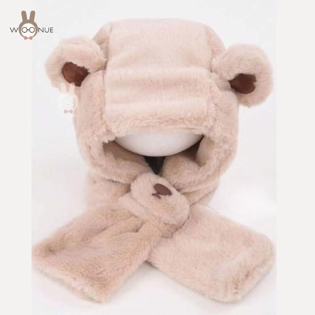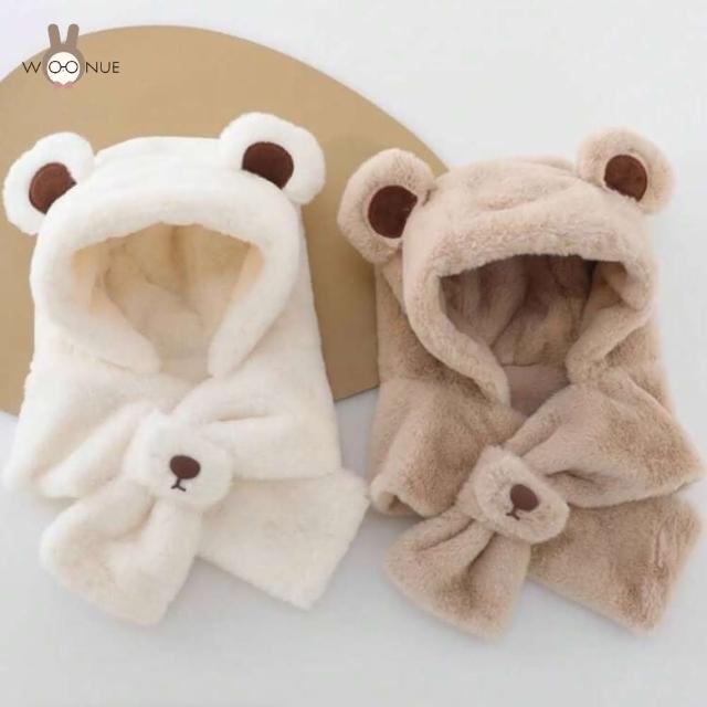 WOONUE超保暖小熊款連帽圍脖兒童帽子2合1毛帽圍巾(親膚保暖時尚超可愛3歲-8歲)
