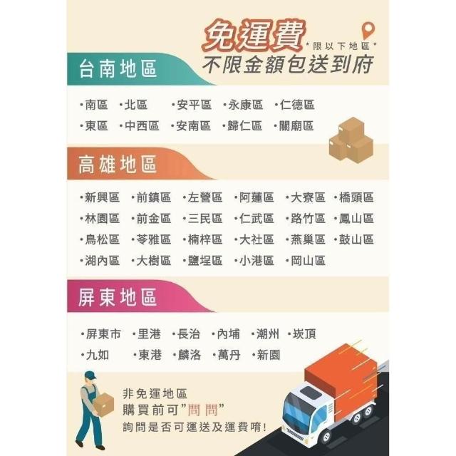 • 針對大型商品(包括:大型家電、家具床墊、健身按摩器材、車類...等),商店將於完成收款確認後,一天內〈不含例假日〉將會有專人與您確認相關配送細節等的聯繫。偏遠地區、樓層費及其它加價費用,皆由商店於約定配送時一併告知,商店將保留出貨與否的權利。