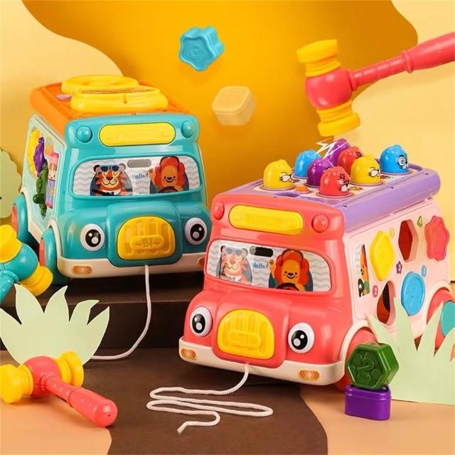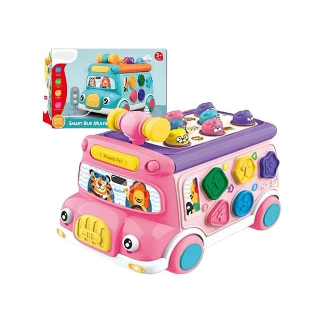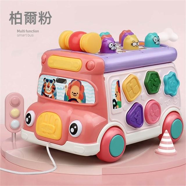 童樂園店鋪益智多功能聲光巴士小車車(益智兒童玩具 打地鼠 形狀積木配對 聯動齒輪 認知時鐘 聲光音樂)