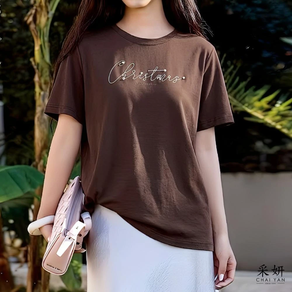 CHAI YAN 采妍珍珠線條字母滑棉短袖上衣 春夏新款-65-78公斤可穿