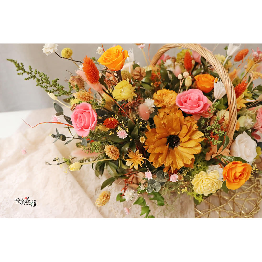 - 兩者為不同的製作方式。 乾燥花材—為自然風乾乾燥而成,顏色會依時間漸漸變成比較枯黃,因脫水所以質地較硬脆。 永生花材—透過特殊技術保存了鮮花的色澤、形狀、質感,製作過程較費時費工。