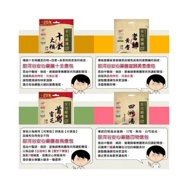 甜河谷安心藥膳 十全大補/當歸黃耆/首烏靈芝/四物加味/四神湯/肉骨茶/燒酒雞(燉包)