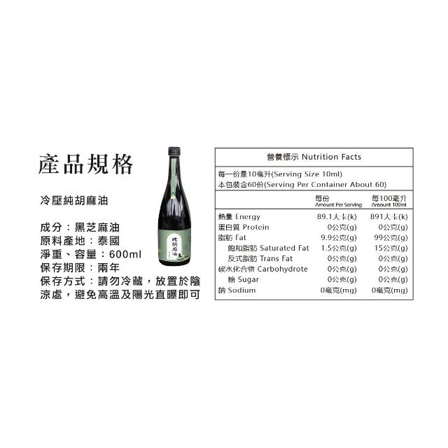 金弘麻油花生行 冷壓純胡麻油 胡麻油 黑芝麻油 芝麻油 300ml 600ml 玻璃瓶 全素可食|繁華中西藥局|