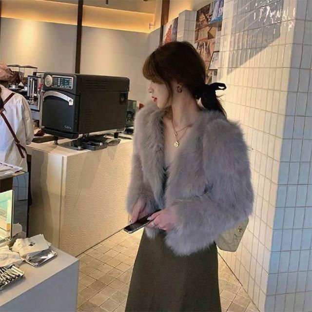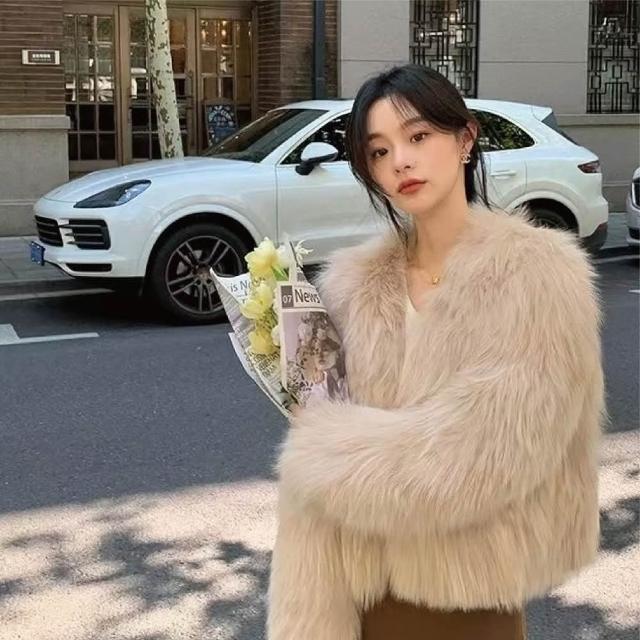HELENA仿狐狸毛皮草短版外套(毛絨外套 V領 仿貂毛 毛衣 A2116)