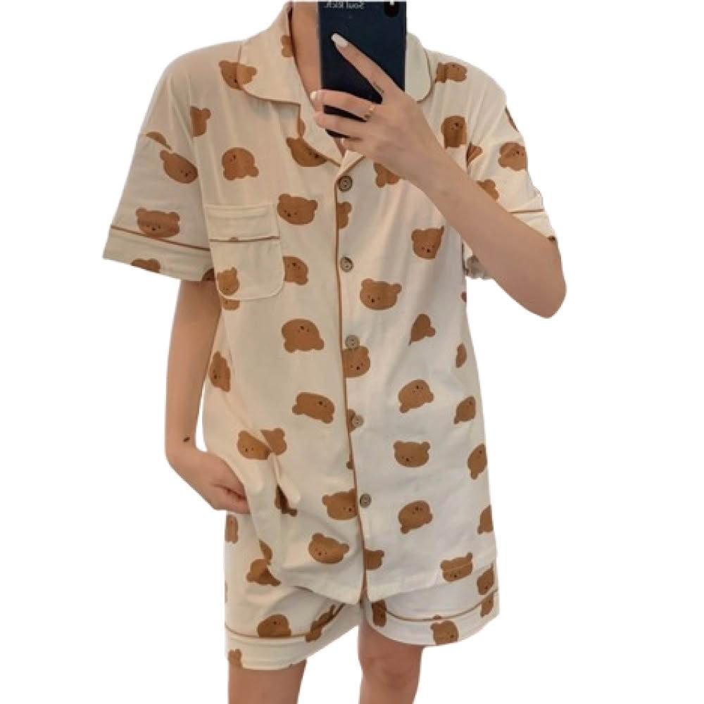 HELENA甜美可愛女生 乳牛睡衣 小熊睡衣 開衫短袖睡衣 兩件式家居服 長褲 睡衣套裝 睡衣女 春夏 A1118
