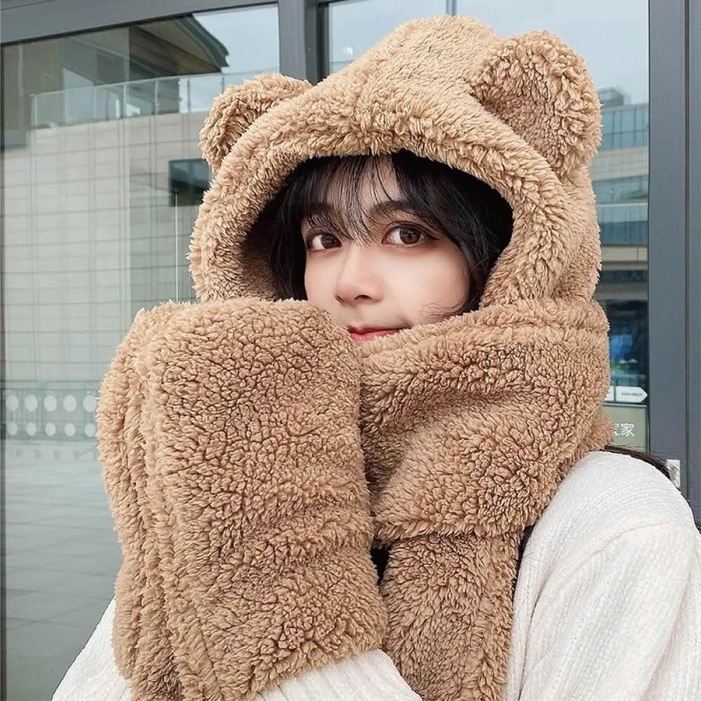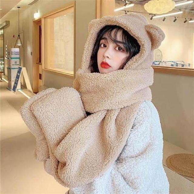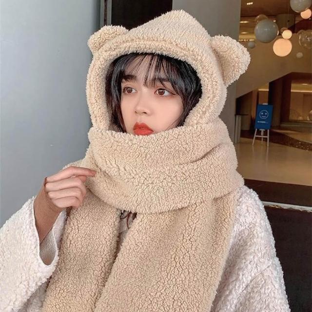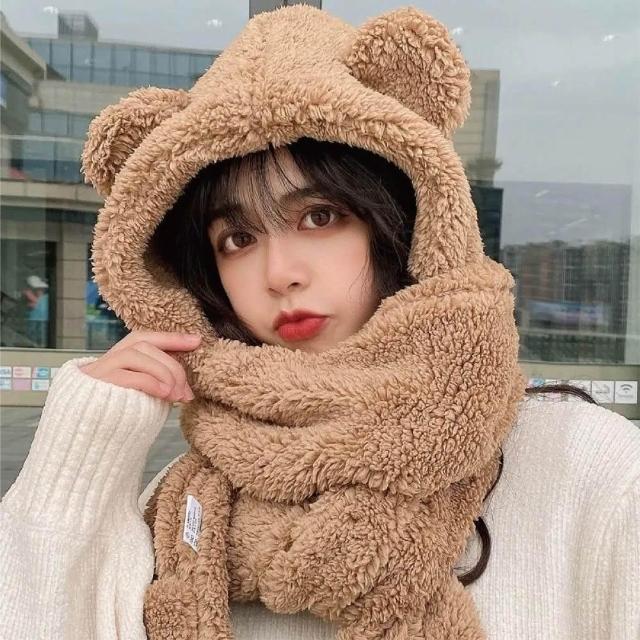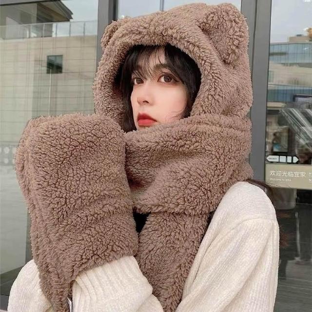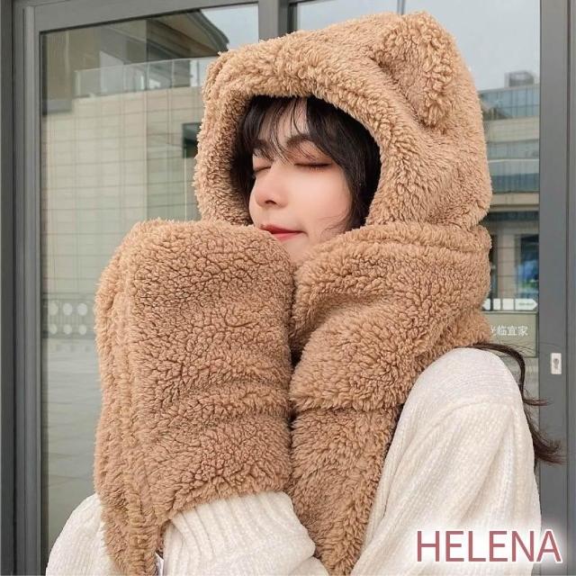 HELENA小熊帽子圍巾 圍脖 熊熊圍巾 帽子圍巾手套一體 保暖舒適百搭絨毛圍巾 出門必備 圍巾女 秋冬 D97