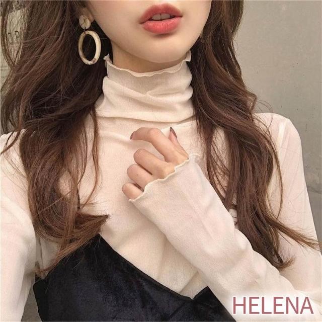 HELENA木耳邊高領透膚網紗上衣 長袖T恤 內搭衣 素色韓版彈力舒適顯瘦打底衫 素T 上衣女 秋冬 A2232
