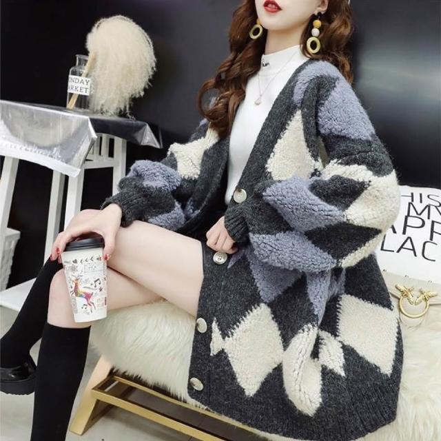 HELENA格紋針織外套 毛衣外套 長袖開衫衣 復古慵懶風韓版寬鬆顯瘦休閒百搭針織衫 外套女 秋冬 A2109