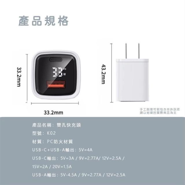ONAIR30W數位顯示 PD QC快充雙孔充電頭(充電頭 快充頭 插頭 豆腐頭 充電 充電器 安卓頭 蘋果頭 插頭)