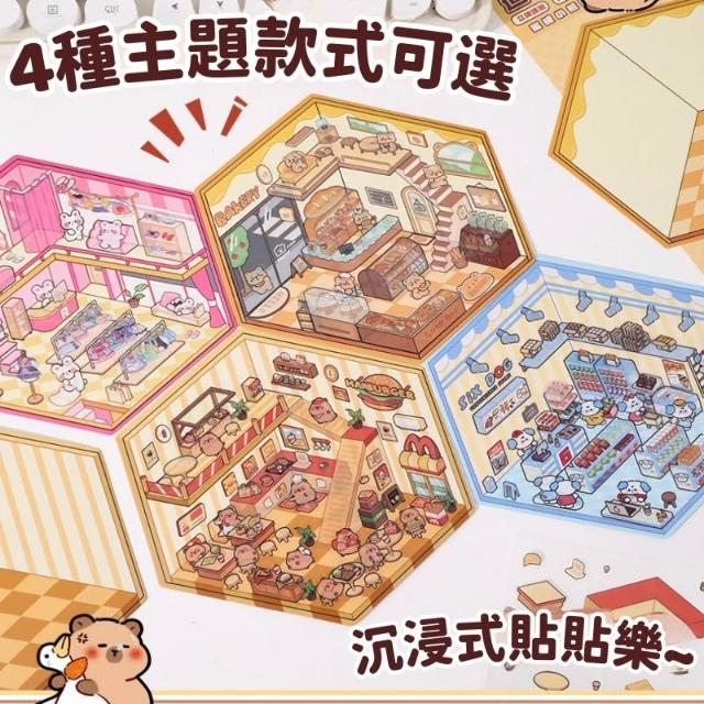 PET可撕貼造景貼紙套裝|覆膜底板反覆玩|漢堡店/便利店場景|附立體效果卡+創意教學指南|