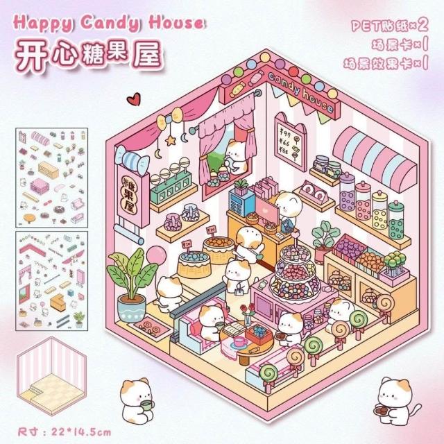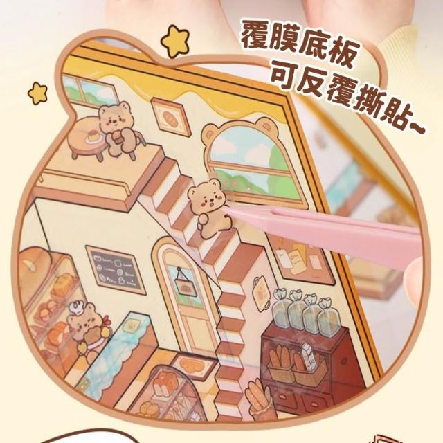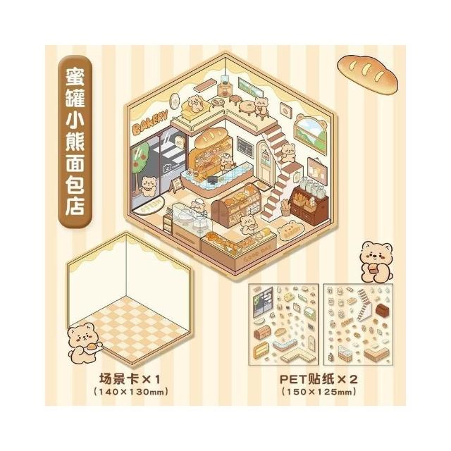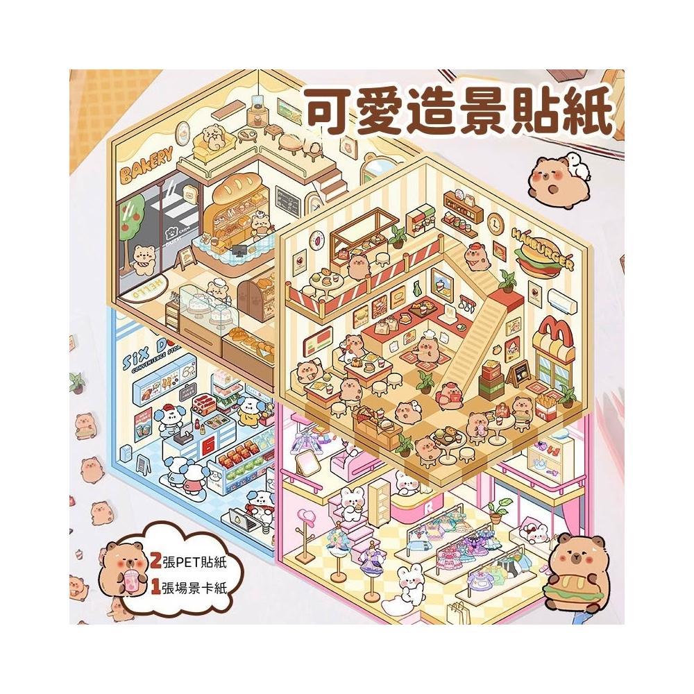 PET可撕貼造景貼紙套裝|覆膜底板反覆玩|漢堡店/便利店場景|附立體效果卡+創意教學指南|