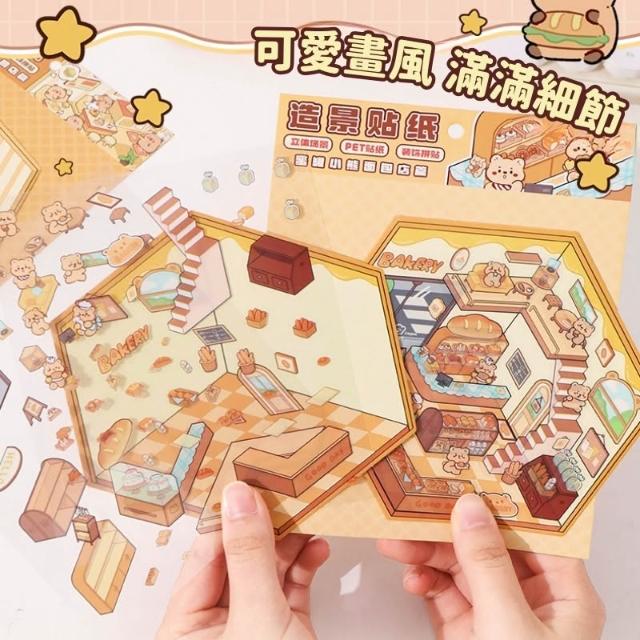 PET可撕貼造景貼紙套裝|覆膜底板反覆玩|漢堡店/便利店場景|附立體效果卡+創意教學指南|