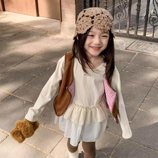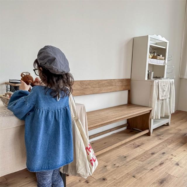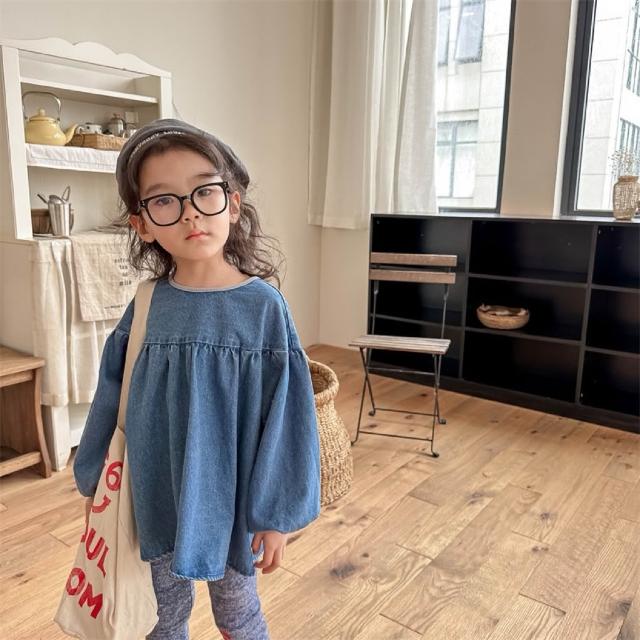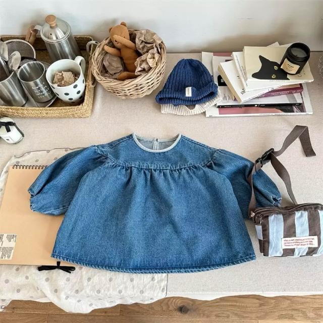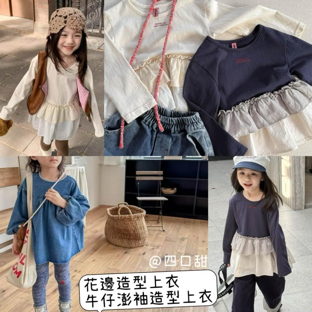四口甜台灣現貨春秋新款80-130女童日系花邊牛仔澎澎袖可愛造型上衣