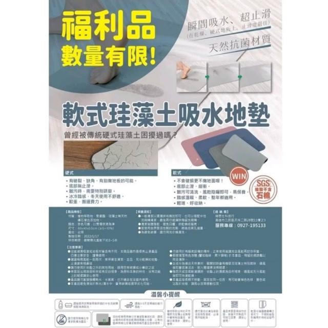 [RYANZ] 軟式珪藻土吸水地墊 20秒進階瞬吸 60x40cm 軟性硅藻土吸水墊 (福利品 兩片588元)