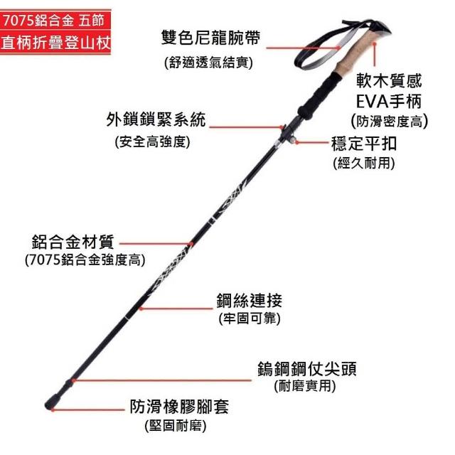 RYANZ7075鋁合金折疊伸縮登山杖 軟木質感EVA握把 五節折疊外鎖 直柄健走杖(附收納袋)