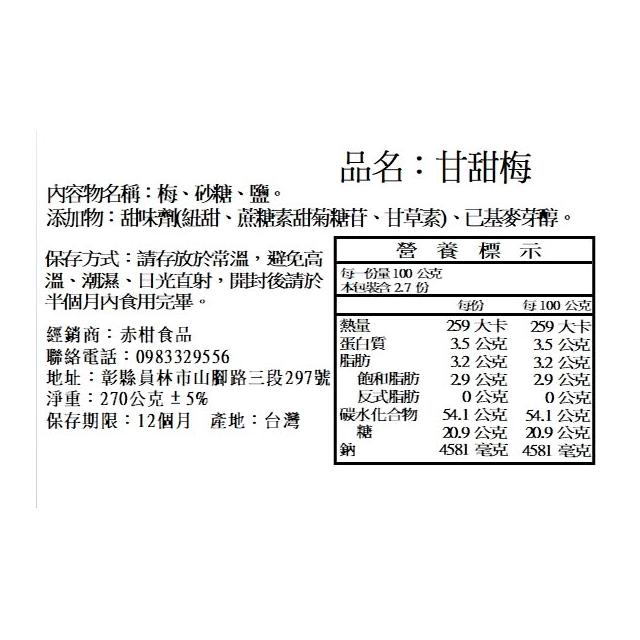 赤柑食品甘甜梅 270g(蜜餞 果乾 梅子 梅 話梅 甜菊梅 古早味)
