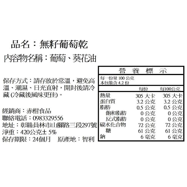 赤柑食品智利葡萄乾 420g(蜜餞 果乾 葡萄 無籽 異國水果 水果乾 智利 無添加)