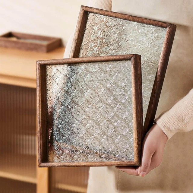 復古海棠壓花玻璃托盤 海棠花玻璃 窗花 木托盤 玻璃托盤 點心盤 復古家飾 茶盤 儀式感餐具(復古海棠壓花)