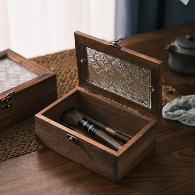 海棠壓花玻璃收納盒 桌上收納盒 木盒 飾品盒 首飾盒 置物盒 小物收納盒(復古窗花 收納盒)